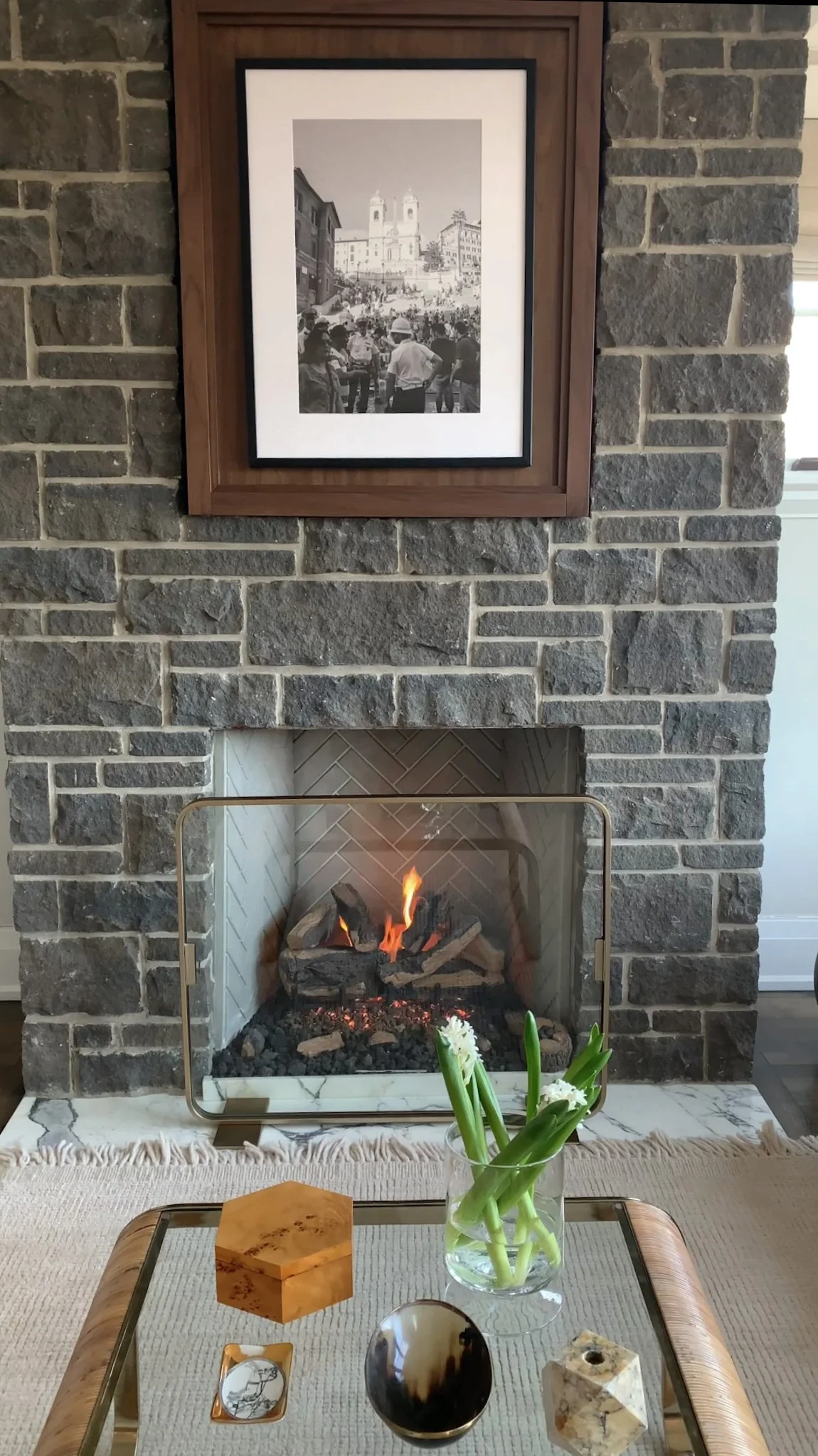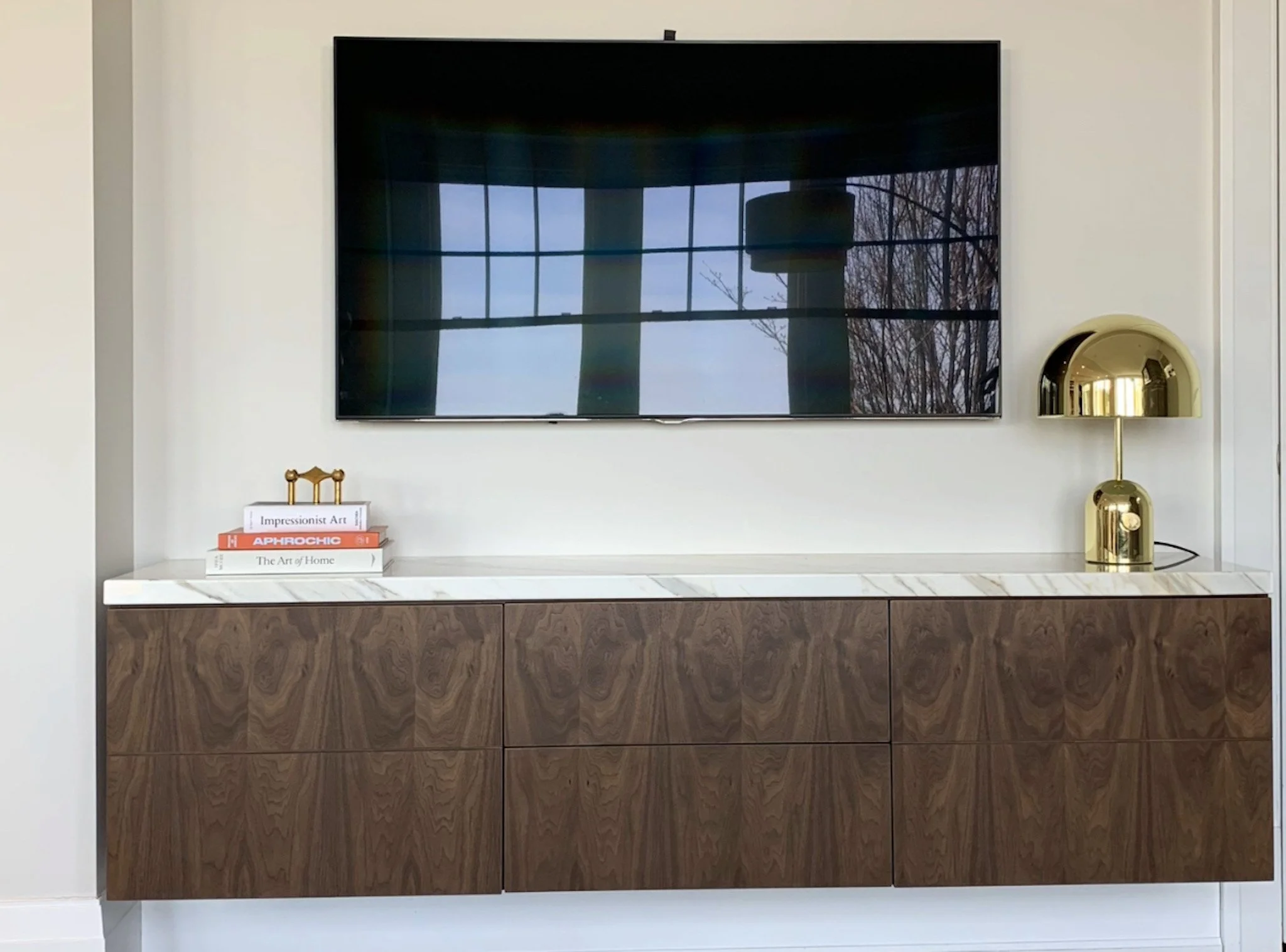 We designed custom high end millwork that’s both beautiful and smart. The media unit features stunning bookmatched walnut drawers and a sleek Calacatta Borghini marble top, providing a perfect solution to conceal all wires and components. A complementary millwork piece is also recessed into the fireplace, creating a beautiful spot to showcase black and white photography.